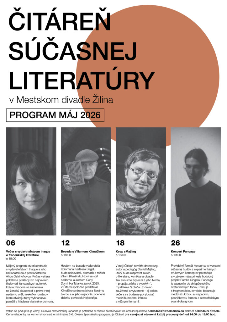 Máj v Čitárni súčasnej literatúry program ponúkne štyri inšpiratívne večery. Mesiac otvoríme stretnutím s vydavateľstvom Inaque, ktoré v Čitárni opäť priblíži francúzsku literatúru v súčasných prekladoch a edíciách zameraných na ženskú skúsenosť, identitu a spoločenské témy. Nasledovať bude beseda so spisovateľom Viliamom Klimáčkom, ktorý uvedie svoju tvorbu vrátane zbierky poviedok Hejtovaňja, reflektujúcej súčasnú spoločnosť s iróniou a nadsádzkou. Literárne večery dopĺňa beseda s Danielom Majlingom, ktorý sa v Čitárni predstaví s ukážkami svojej literárnej, komiksovej a dramatickej tvorby. Májové podujatia uzatvorí koncert hudobného projektu Pancage Patrika Cingeľa, ktorý prináša experimentálny prístup k hudbe na pomedzí minimalizmu, fragmentu a zvukovej štruktúry.