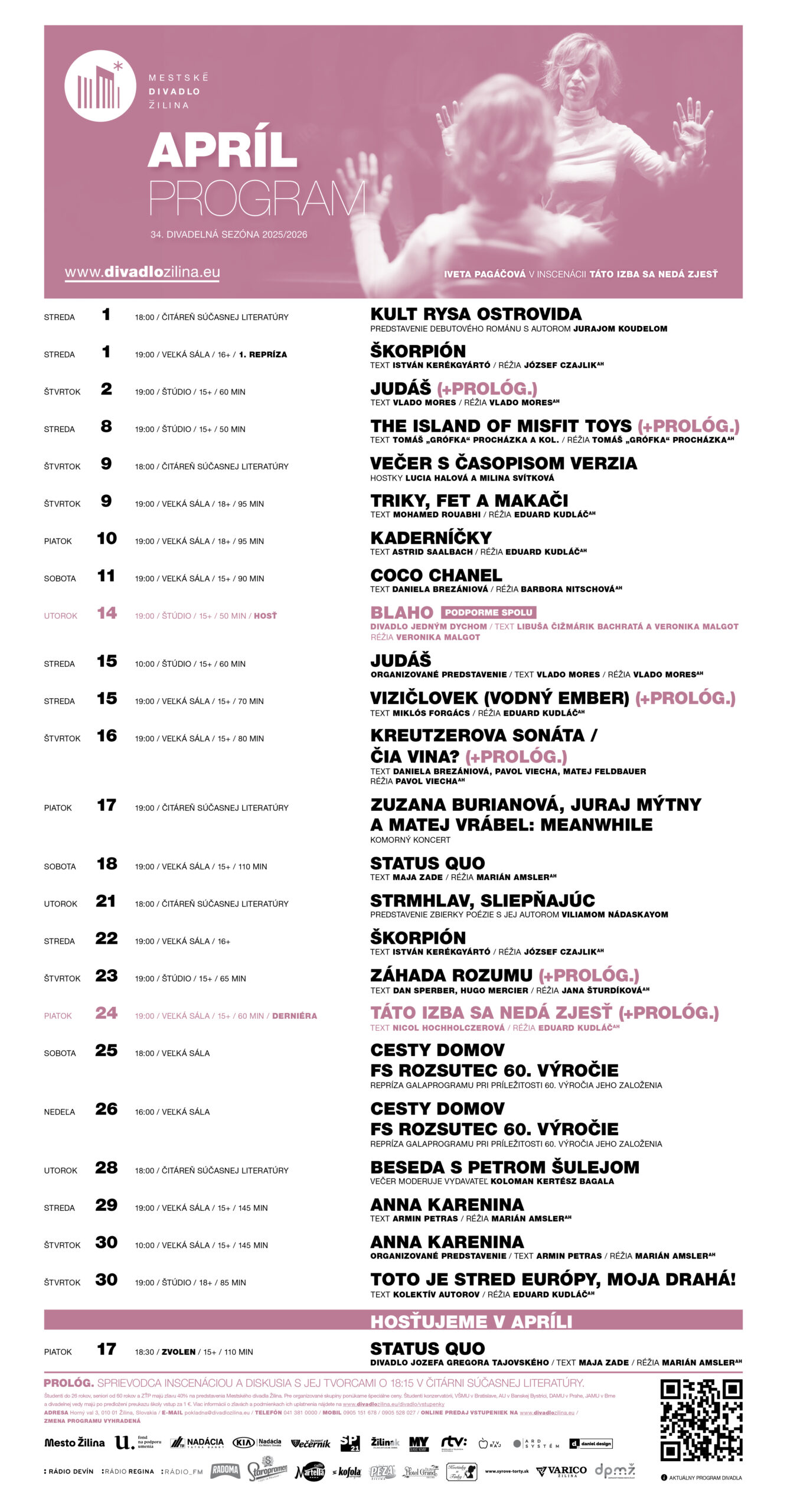 v aprílovom programe vás čaká pestrá ponuka autorských projektov, komédií, komorných spracovaní klasiky a monodrám, doplnená o podujatia Čitárne súčasnej literatúry a hosťujúce predstavenie v rámci minifestivalu nezávislého divadla Podporme spolu.