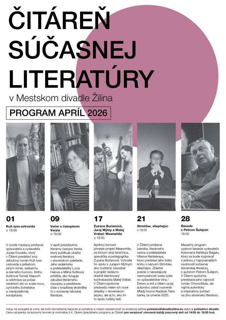 Aprílový program v Čitárni prinesie opäť pestrý výber inšpiratívnych podujatí o súčasnej literatúre ale aj hudbe. Mesiac otvorí spisovateľ a vydavateľ Juraj Koudela so svojím románovým debutom Kult rysa ostrovida. S Luciou Halovou a Milinou Svítkovou predstavíme literárny časopis Verzia, ktorý prináša preklady zo svetovej tvorby. Program obohatí hudobný večer na pomedzí jazzu, soulu a popu s časozberným projektom Meanwhile Zuzany Burianovej, Juraja Mýtneho a Mateja Vrábela. V závere mesiaca privítame Viliama Nádaskaya s jeho ocenenou zbierkou poézie Strmhlav, sliepňajúc a Čitáreň navštívi aj jedna z najvýraznejších osobností slovenskej literatúry, Peter Šulej, ktorý v rozhovore s vydavateľom Kolomanom Kertészom Bagalom priblíži svoj najnovší román Chronofóbia.