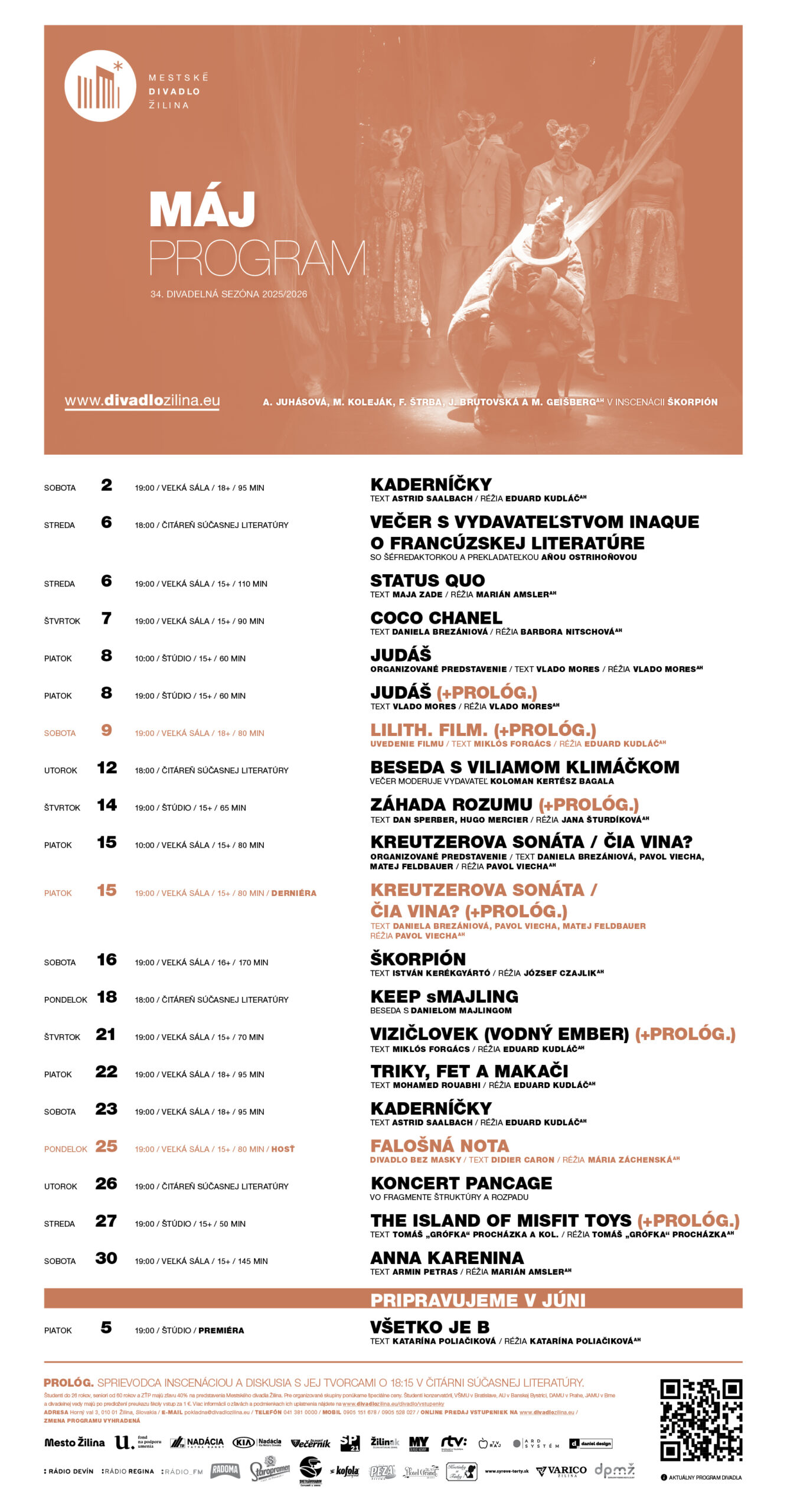 májový program je v predaji a opäť prináša pestrý výber divadelných zážitkov. Vo Veľkej sále a Štúdiu sa môžete tešiť na inscenácie z repertoáru, ale aj na hosťujúce predstavenie a inšpiratívne podujatia v Čitárni súčasnej literatúry.